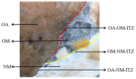 Schematic diagram of interface transition zones (ITZs): OA–order aggregate, OM–order mortar, NM–new mortar, OA-OM-ITZ–the interface between old aggregate and old mortar, OA-NM-ITZ–the interface between old aggregate and new mortar, OM-NM-ITZ–the interface between old mortor and new mortar.