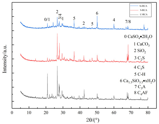 Figure 7 is XRD analysis results of RCA before and after modification. Referring to the existing literature and combining with JADE software to analyze the peak value of the map, the composition of the old mortar was semi-quantitatively analyzed. It can be seen from Figure 7 that the high diffraction peak of SiO2 in Si-RCA is due to the adhesion of nano-SiO2 on the surface of old aggregate mortar, and the high diffraction peak of SiO2 in S-RCA and C-RCA comes from the fine aggregate left in the sample during the sample preparation process. The intensity of CaCO3 diffraction peak in C-RCA is higher than that in Si-RCA and S-RCA, which can be attributed to the generated CaCO3 via chemical reaction between CO2 and CH, C-S-H in old mortar. The diffraction peak of C–S–H is not apparent in this form, but the Ca15SiO3.5·× H2O was generated after crystallization and shows an obvious diffraction peak. Furthermore, the content of Ca15SiO3.5·× H2O in Si-RCA is relatively high because of the chemical reaction between nano-SiO2 and CH in old mortar. Compared with the modified aggregates, the S-RCA exhibits higher diffraction peaks of C2S and C3S, this is probably because CO2 and nano-SiO2 promote the hydration reaction of C2S and C3S in the attached old mortar, resulting in the decrease of the two substances.