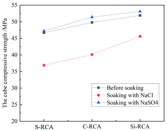 Referring to the Chinese Standard for Test Methods of Mechanical Properties of Ordinary Concrete (GB/T50081-2016), the influence of repair methods on the mechanical properties of RC before and after ion erosion was comparatively analyzed, as shown in Figure 8. It can be clearly seen that Cl− erosion has a significant deterioration on RC after soaking for 30 days. After the process of soaking, the compressive strength of RC prepared by S-RCA, C-RCA, and Si-RCA has decreased by 21%, 19.5%, and 12.1%, respectively. Compared with the former, the compressive strength of RC increases slightly after 30 d of SO42− erosion, which may be due to SO42− reacts with CH and C-S-H in concrete to generate a small amount of AFt, which can fill the pores in concrete [26,27] and thus increase the compressive strength. The above results also reveal that nano-SiO2 modified RC exhibits a higher compressive strength than CO2 cured one.