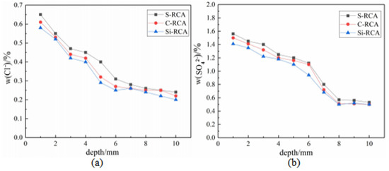 The content of Cl− in RC ground powder was determined by using chemical titration. The test results are shown in Figure 9a. After carbonization and nano-SiO2 curing of RCA, the chloride ion permeability resistance of the modified RC is significantly enhanced, and nano-SiO2 displays superior effect in repairing RCA. This is because the ITZs inside the concrete are the main channel for the penetration and diffusion of chloride ions, and nano-SiO2 can react with the abundant CH at the interface to produce denser C–S–H gel [28], which can densify the unconsolidated ITZs and effectively inhibit the erosion of Cl−. In addition, nano-SiO2 on the surface of RCA can also enter into the concrete mixture, and react with the hydration products to increase the compactness of concrete. The content of SO42− in RC was measured by turbidimetry, and the results are presented in Figure 9b. The modified RC also exhibits an inhibiting effect of SO42− attack. It is noteworthy that the content of SO42− tends to be stable at the depths exceed 8 mm due to the existence of gypsum in concrete mixing species.
