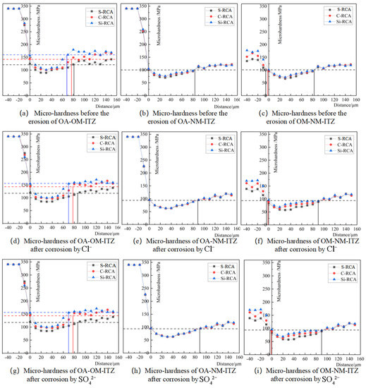 The micro-hardness of ITZs of three kinds of RC before and after ion erosion was tested by a micro-hardness tester, and the interface area was quantitatively characterized. The test results are shown in Figure 10. From Figure 10a,d,g, we can clearly see that the micro-hardness of OA-OM-ITZ of modified RC is higher, and the width of the interface zone is smaller than that of concrete prepared from the simple crushed RCA, before and after ion erosion. Before ion erosion, compared with S-RCA recycled concrete, the micro-hardness of OA-OM-ITZ of C-RCA and Si-RCA recycled concrete increased by 7.0–12.0% and 14.2–31.1%, and the width of ITZ decreased by 3.7% and 16.0%; after Cl- erosion, compared with J-RCA recycled concrete, the micro-hardness of OA-OM-ITZ of C-RCA and Si-RCA recycled concrete increased by 13.5–13% and 17.6–29.6%, and the width of ITZ decreased by 9.2% and 19.5%; after SO42− erosion, compared with S-RCA recycled concrete, the micro-hardness of OA-OM-ITZ of C-RCA and Si-RCA recycled concrete increased by 13–9.8% and 23.2–30.1%, and the width of ITZ decreased by 11.4% and 13.9%. Figure 10c,f,i shows the OM-NM-ITZ micro-hardness change law is the same as that of OA-OM-ITZ, which reflects the fact that the interface zone of RC prepared by Si-RCA has better compactness and better resistance to ion erosion. However, the micro-hardnessof the OA-OM-ITZ changes more The micro-hardness value of new mortar is smaller than that of old mortar, and remains the same. This is because carbonization treatment and nano-SiO2 soaking mainly act on the old mortar on the RCA, and the mixture ratio of the new mortar of the RC is the same, so the micro-hardness value of the new mortar of the modified RC is almost the same. It can be seen from Figure 10b,e,h that under the same erosion environment, the restoration effect of RCA on OA-NM-ITZ is not apparent, and the width of the interface area is consistent; Comparing ITZs at the same interface under different erosion environments, it can be found that, compared with non-soaked RC, Cl− erosion makes the micro-hardness of each interface zone decrease and the width of the interface zone increase, while SO42− erosion makes the micro-hardness of each interface zone slightly increase and the width of the interface zone decrease. Taking Figure 10b,e,h OA-NM-ITZ as an example, compared with before soaking, the width of the interface zone after Cl− erosion increases by about 7.2%, and that after SO42− erosion decreases by about 4.8%. This is because ITZs are enriched in large amounts of calcium aluminate hydrate and CH [29]. Cl− reacts with calcium aluminate hydrate through the high-porosity ITZ to form Friedel salt, which continues to react with CH to form the diffusely soluble complex CaCl2, thus softening ITZs, reducing their hardness, and increasing their width accordingly. On the contrary, due to the short erosion time, SO42− reacts with CH and C-S-H at the interface to form AFt and gypsum, which increase the hardness of ITZs.