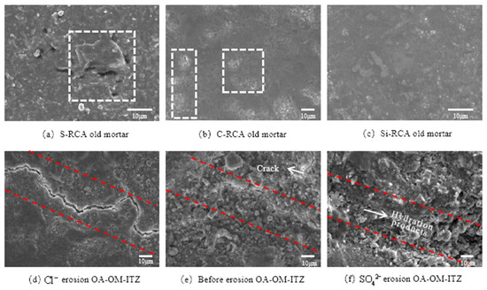 According to the micro-hardness test results, we found the OA-OM-ITZ in modified RC and the old mortar matrix show higher micro-hardness values. Therefore, the old mortar matrix before ions erosion was characterized by SEM, as shown in Figure 11a–c. It can be seen that the surface of the old mortar matrix of RC prepared by S-RCA exhibits obvious holes and loose microstructure features; The surface of the old mortar matrix under C-RCA and Si-RCA are more compact, flat and without obvious pores. The above results are consistent with the result of high micro-hardness of the modified old mortar matrix. Figure 11d–f are the micro-topography of OA-OM-ITZ of RC prepared by Si-RCA under different erosion environments. It is obvious that the microcrack width in the ITZ is narrow before ions attack. However, a significant increase in the microcrack width of the interface occurred after 30 days’ immersion in chloride solution. Moreover, the content of hydration products and microcrack are decreased, and this may be due to the produced double salts and other products of the reaction between Cl− and CH, which break the balance state of CH and C–S–H gel. As a result, the C–S–H gel continues to decompose, result in the further expansion of microcrack in ITZ. In contrast, after the erosion of SO42− for 30 days, many irregular hydration products are enriched at the interface, and the microcrack becomes unclear (Figure 11f). This is because under the dual action of SO42− and nano-SiO2, the micro-cracks and pores are filled, and thus bring about the densification of the interface area.