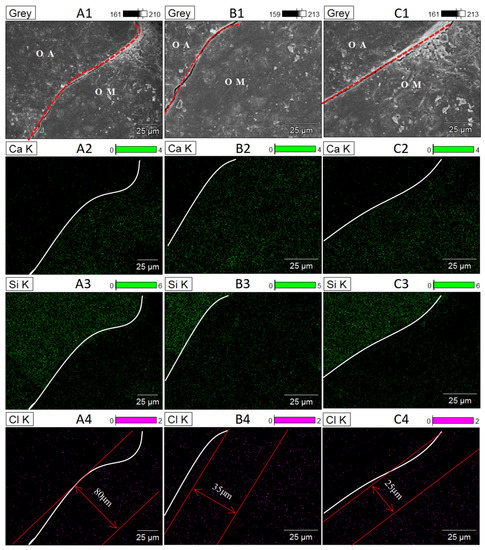 Surface features and the corresponding elemental mapping of OA-OM-ITZ after Cl− attack: (A1–A4) S-RCA recycled concrete, (B1–B4) C-RCA recycled concrete, (C1–C4) Si-RCA recycled concrete.
