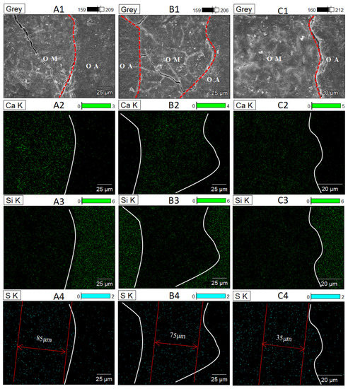 Surface features and the corresponding elemental mapping of OA-OM-ITZ after SO42− attack: (A1–A4) S-RCA recycled concrete, (B1–B4) C-RCA recycled concrete, (C1–C4) Si-RCA recycled concrete.