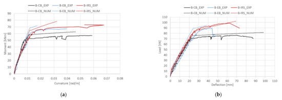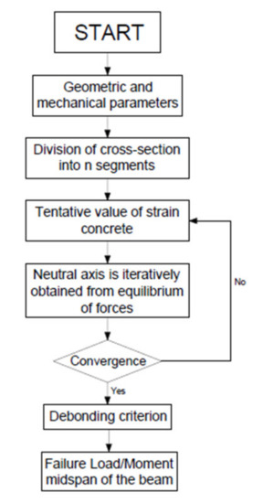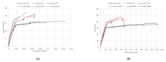 - The assumption of a perfect bond between materials leads to slightly stiffer behaviour of the numerical curves in the first stage (until the yielding of the internal tensile reinforcements). In any case, the yielding and failure loads are accurately predicted by the calculation procedure. Further development of the code could take into account a suitable bond–slip law between reinforcing steel bars/concrete and external composite material/concrete.