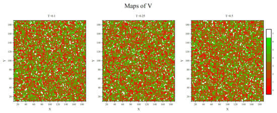 Figure 1 shows two-dimensional (2D) maps of parameter — instantaneous sections of 3D system—for three temperatures: below, close to and above glass transition temperature . A typical map is a complex intertwining mosaic (originally proposed a long time ago []) of local areas (cells) occupied (red) and unoccupied (green) by monomers (see Section 2.2 for technical details).
