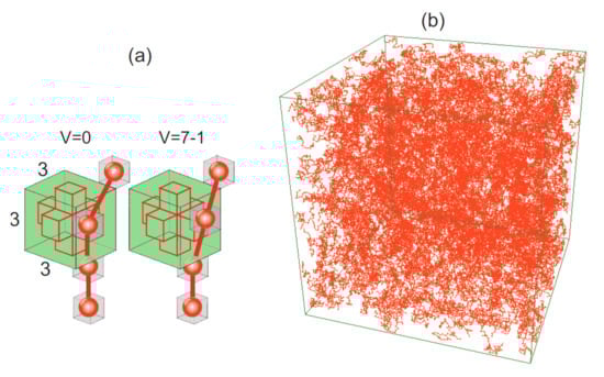 The local void parameter characterizes the degree of local inhomogeneity of the distribution of monomers around lattice point at time t. The quantification of this concept is based on the occupancy of a cube with center at lattice point , see Figure 2a. The central cross consists of the cell at lattice point and its 6 nearest neighbours. If a monomer occupies a position inside the cross then the central cell is considered as blocked and the value of local void parameter is set to zero: . Otherwise , where is the number of monomers inside the cube. Thus, parameter V characterizes the strength of steric hindrances—they become important for low values of V and, on the other hand, negligible for its high values. We have used , which is the maximal occupancy of a cube by monomers found in the simulations [,,]. The cube used in the modeling corresponds approximately to the volume for PMMA chains [,].