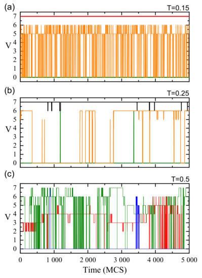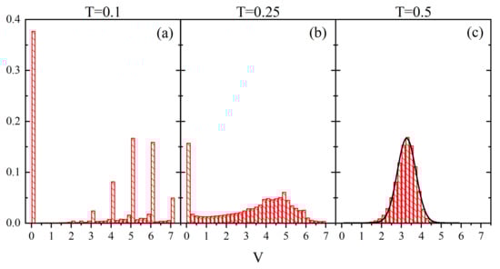 Figure 6 shows normalized empirical histograms which represent the probability density , calculated from all the cells in the system. Clearly, three distinct regimes are present. At low temperatures (, Figure 6a), the distribution displays peaks for integer values of V, with negligibly small bars otherwise. The heights of the peaks reproduce the probability distribution of random variable in a static configuration V [,]. Correspondingly, the vast majority of the cells are frozen in the time interval , reflecting, in particular, the presence of a very long tail of times of life for discussed above. Close to the glass transition (, Figure 6b) a new feature appears: the probability distribution becomes smooth, with the exception of the peak at . The remaining part displays a flat maximum in the interval . Finally, in the high temperature regime (, Figure 6c) the probability density becomes nearly gaussian, with a maximum at and standard deviation .