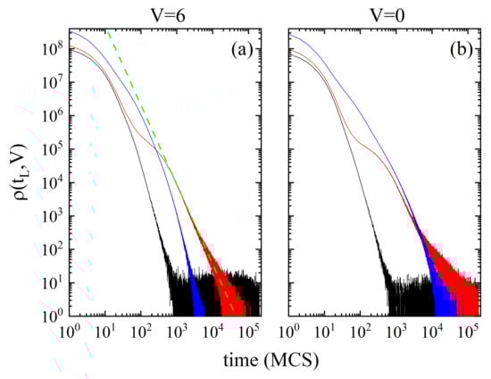 To quantify the aforementioned qualitative conclusions two approaches were used. The first one concerns the characterization of times of life of local voids with fixed value of parameter V. To this end, the times of life of such cells were monitored during the whole simulation ( MCS) and the empirical histograms, representing the probability distribution , were constructed. This kind of analysis provides an information about the maximal as well as typical time scales related to local dynamics of free volume.