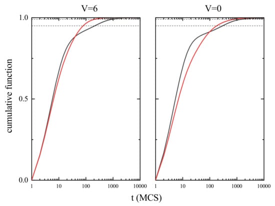 Figure 4 shows the plots of against MC time for and . This choice is dictated by their exceptional properties [,]—the corresponding cells form the two main components of quasi-binary mosaic-like states. Consider first the case (Figure 4a). Such cells are nearly free of monomers in their closest neighbourhood and group into scale-free (fractal) clusters [,]. At low temperature () a smooth decrease of the probability distribution is followed, starting from MCS, by an irregular behaviour corresponding to longer times of life, up to MCS (i.e., the time of the simulation). We point out that the plot is incomplete—its missing part corresponds to a large concentration (around 44%) of cells with MCS. This situation is typical for MC simulations at low temperatures, and is caused by weak thermal fluctuations of the polymer matrix. For a high temperature () a smooth decay of the probability distribution is present, with a maximal value of around MCS. Close to () much longer times of life are present, up to MCS. The plot displays a new feature: it has two inflection points which mark two different regimes. In the first one the plot matches the plot for . In the second regime some features characteristic for a power law (over 2 but not 3 decades) are present: