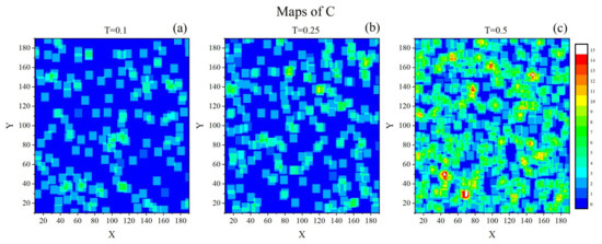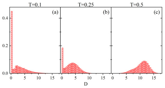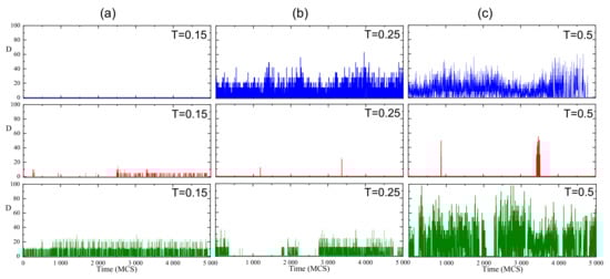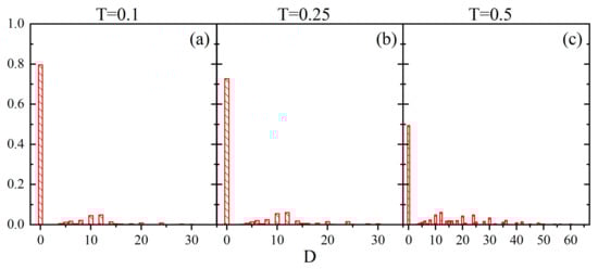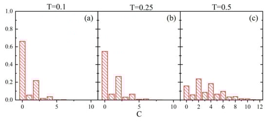 Those observations are fully supported by empirical probability distributions calculated from a single realization of the configuration , shown in Figure 8. At low and intermediate temperatures, the dominant mobility corresponds to , while at a higher temperature a wider spectrum of values C (up to ) is present.