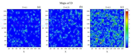 Figure 10 shows the evolution in time of parameter for three representative cells, at three temperatures. In what follows we interpret the results in terms of a rotational diffusion promoted by the temporal evolution of this field. At a low temperature the maximal value of D corresponds to and , thus . The first cell represents the case without an orientational diffusion. In the second cell a weak diffusion is present in a half of the short simulation period, with . Third cell displays a moderate diffusion interrupted by short periods of a high activity, with . Close to the glass transition parameter reads approximately (see Figure 8). A large variety of patterns of temporal evolution are present, including lack of diffusion, moderate/strong diffusion in the simulation period, as well as periods of moderate diffusion separated by periods of strongly hindered diffusion. The case of a high temperature () is similar, with one exception—no alternating periods of activity/inactivity were observed.