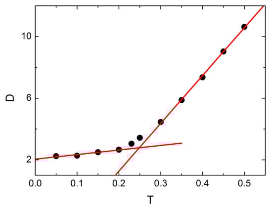 Figure 14 shows the plot of temperature dependence of parameter D. Two linear regimes, for low and high temperatures, are separated by a non-linear regime in the interval . The linear fits intersect at , clearly marking the change of the regimes, and providing an estimation of . It is in a good agreement with previous estimations of based on MC simulations of geometric parameters like square radius of gyration () or mean free volume (), physical parameters ( for mean bond energy) and non-linear optical processes (angular hole burning yields , all-optical poling—) [,].