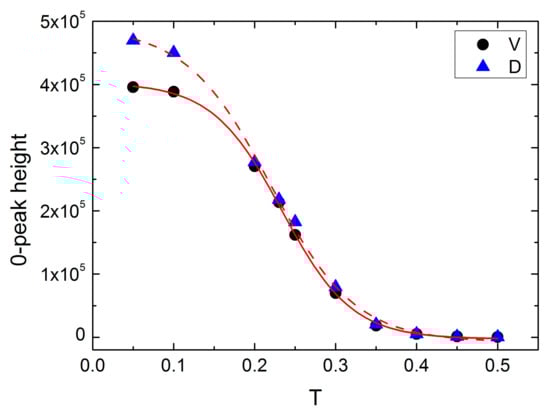 The second approach, based on the probability densities (Figure 6) and (Figure 13), offers an elegant, geometric-based criterion for the glass transition temperature. Namely, both plots display sharp peaks located at , which corresponds to the blocked () part of the matrix. The amplitude of those peaks decreases as the temperature increases, see Figure 15. Both plots, which display a change of convexity at some temperature, were reasonably well fitted using Boltzmann function (Origin 9.5):