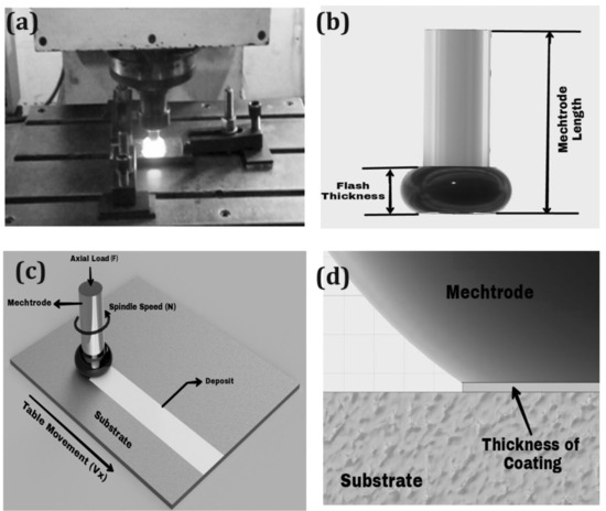 As the mechtrode and substrate, stainless steel plates AISI316Ti and EN8 are employed. The surface flatness was machined by milling at the top and bottom of the rod, and the surface finish was rendered by a grinding machine to achieve an oxide-free level surface. Before the experiment, mechtrode and substrate were washed with acetone to eliminate pollution. To precede the experimental work, a customized friction-surfacing machine (Modified milling machine JMD-18 JET) was used. With a nominal rotational speed of 3000 rpm, the system can be loaded up to a maximum axial load of 10 kN.