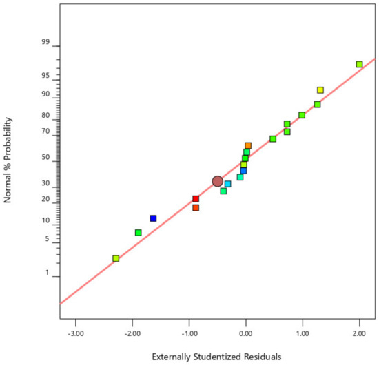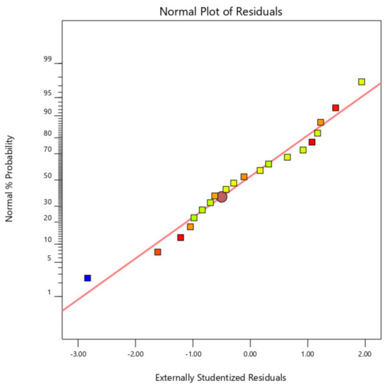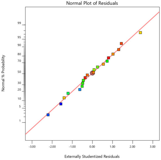 Figure 2, Figure 3 and Figure 4 display the standard plot of residuals for coating thickness (Ct), covering width (Cw), and bond strength (Bs). It is clear that the points on the standard plot are similar to the straight line and due to the expected R2 values of 0.9732 and 0.9721, there are no differences in the thickness and width of the coating. Some amount of deviations in the bond strength is observed due to the material being plasticized during the friction surfacing process. The predicted R2 for bond strength is lower than the coating thickness and coating width values, which is 0.8738, resulting in a deviation from the straight line of the normal plot due to which the percentage of error of the actual value with the predicted value will increase.