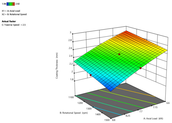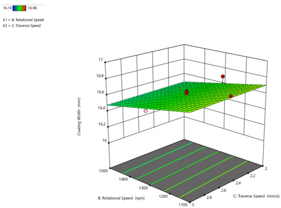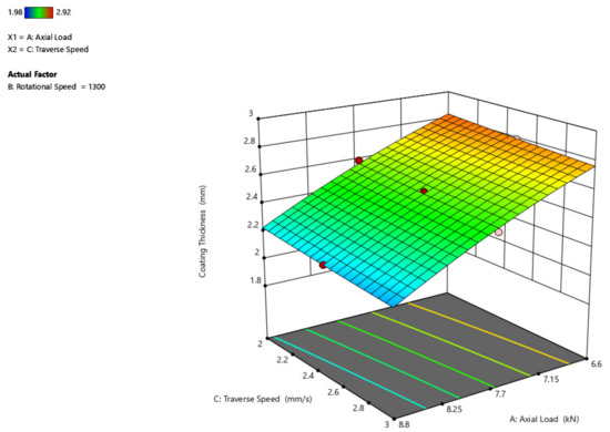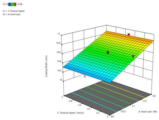 The 3D surface plot is shown in Figure 9, showing the influence of axial load and traverse speed over coating width. If studied from the preceding figure, it is anticipated that as the axial load increases, the width of the coating grows and that when compared to the traverse speed, the width of the coating has little influence, where the width increases by a maximum of 1 mm.