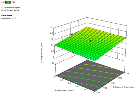 In comparison to the axial load and rotational speed, the traverse speed has no detrimental influence on the thickness of the coating, as shown in Figure 6. Despite the increased traversal speed, the coating thickness stays constant [32]. When the traverse speed is maximum (3 mm/s) and the axial force is maximum (8.8 kN) the thickness of the coating would be minimal.