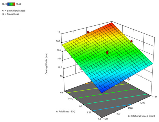 The influence of rotating speed and axial load on coating width is shown in Figure 8. The coating width increases as the axial load increases from 6.6 kN to 8.8 kN with a range of 5 mm, and the coating width increases to a reduced point of 1 mm with the increasing rotational speed even.