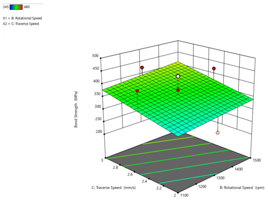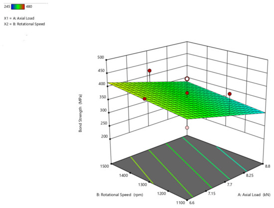 The bond strength interaction plot with respect to the axial load and rotational speed parameters (Figure 11), axial load and traverse speed (Figure 12), and rotational speed and traverse speed (Figure 13), is shown. There is an ascending peak in the values of the bond strength which ranges from 300 MPa to 425 MPa for an increase in the axial load from 6.6 kN to 8.8 kN and also has less effect on the rotational speed and traverse speed to the bond strength. As the rotational speed increases, the bond strength gradually diminishes.
