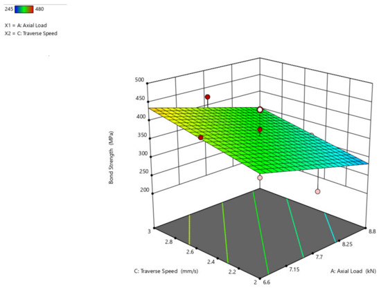 From the response surface graph shown in Figure 12, it is concluded that there is an increase in axial load from 6.6 kN to 8.8 kN, a significant increase in bond strength from 300 MPa to almost 450 MPa, and a decrease in bond strength with an increase in traverse speed and slowly increases with an increase in traverse speed from 2.6 mm/s to 3 mm/s. When compared to axial load, the traverse speed has less impact on the bond strength.