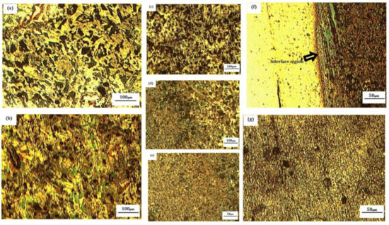 Microstructure analysis of friction surfacing AISI316Ti over EN8 alloy: (a) grain structure of the substrate; (b,c) grain structure of the mechtrode; (d–g) microstructure at the interface regions.
