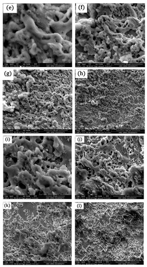 The microstructure SEM study carried out using FEI Quanta FG200 HRSEM shown in Figure 16a–j, as obtained, indicates the specific magnification of AISI316Ti friction coated coatings over EN8 steel. As the optical microscopy did not foresee the secondary components, SEM images were taken out to know the dissolution of dissimilar materials. Large ferrites appeared during the solidification process which precipitated from the austenitic phase due to the very high alloy composition of EN8 steel. Dimensions of tool steel’s primary ferrite range between 5 μm and 10 μm in diameter. It is due to high deformation during the surfacing phase of the friction. Because of the complex re-crystallization, the grain sizes were reduced to 2–3 μm when the metallic materials were subjected to extreme plastic deformation [37]. The grain coarsening occurs due to the heat produced in the high reduction hot working cycle, which causes high dislocation density and numerous stacking faults due to very high deformation and combined effect of heat and plastic deformation [38], which causes high dislocation density and numerous stacking faults. Due to the phase transition from BCC to FCC, the EN8 steel requires partial austenitization and often provided coarse and heterogeneously scattered carbides in solidified conditions.