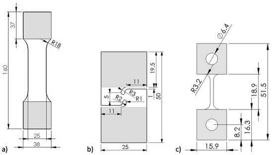 Geometries utilized to conduct tensile tests (a), simple shear tests [17] (b), and intermediate and high-rate tensile tests [18] (c). Note that all units are in mm and that the shaded area corresponds to the material section that was clamped during testing.