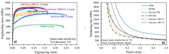 Figure 14 provides a comparison of the strain rate effects of one representative repeat utilizing the change in the stress at a respective strain rate with respect to the stress at the reference strain rate at a plastic strain level of 5%. In contrast to the 3rd Gen 1180 V1, the strain rate-sensitivity is rather mild for the 3rd Gen 1180 V2, particularly for the strain rates between 100–1000 s−1. The lower rate sensitivity of the 3rd Gen 1180 V2 is likely attributed to its stronger dependence upon microstructural transformation of austenite that is inhibited at higher strain rates and by higher local temperatures due to adiabatic heating [38]. A direct comparison of the rate-dependent stress increase reveals strain rate effects which are by a factor of approximately four greater for the 3rd Gen 1180 V1 (stress differential of 103 MPa and 149 MPa between a strain rate of 0.001–1000 s−1 for the 3rd Gen 1180 V2 and V1). No experimental rate-dependent data was available for the DP1180 Benchmark steel. The observed strain rate effects for the 3rd Gen 980 steel are slightly higher compared to the DP980 steel at a strain rate of 100 and 1000 s−1 and is more comparable to the 590R.