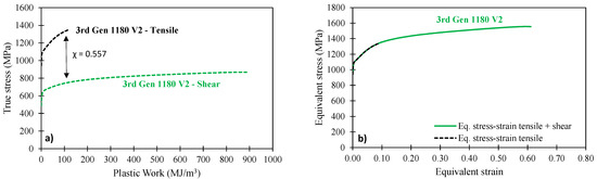 True stress versus plastic work (a) and converted equivalent stress-strain response for the 3rd Gen 1180 V2 (b).
