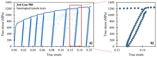 Interrupted tensile tests with a total of 8 unloading cycles for the 3rd Gen 980 (a) and close-up view of the non-linear unloading behavior, schematically shown for the seventh unloading cycle (b).