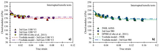 Measured and calibrated chord modulus evolution using the Yoshida model [29] for the 1180 MPa ultimate tensile strength steels (a) and the 590 MPa and 980 MPa strength steels (b). Note that the data for the DP980 and the DP1180 was digitized from the study of Cobo et al. [31].