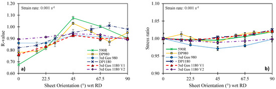 Comparison of R-value (a) and stress anisotropy (b) for the studied steel grades.