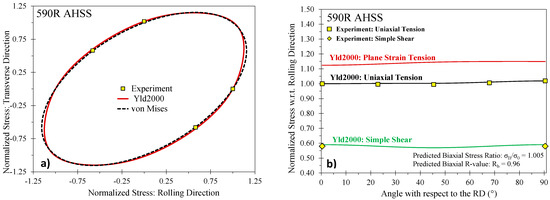Calibrated Barlat Yld2000 yield surface for the 590R (a) and predicted stress ratios (b).