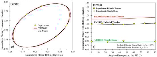 Calibrated Barlat Yld2000 yield surface for the DP980 (a) and predicted stress ratios (b).
