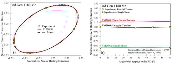 Calibrated Barlat Yld2000 yield surface for the 3rd Gen 1180 V2 (a) and predicted stress ratios (b).