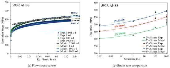 Strain-rate effects for the DP980 steel were studied in Zhumagulov et al. [37] and calibrated using the modified Cowper–Symonds model in Equation (12) and the coefficients in Table 7.