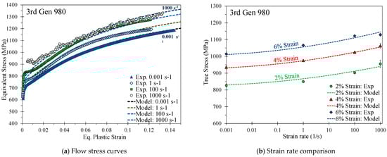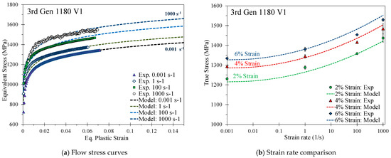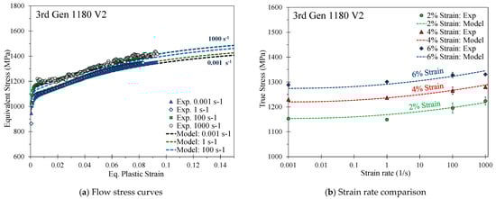 For the 3rd Gen 1180 V2, which had lower strain rate effects as shown in Figure 13, the flow behavior was well-captured using a modified Cowper Symonds model to incorporate the logarithmic term as