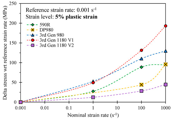 Comparison of the strain-rate induced increase in the flow stress at higher strain rates with respect to the stress level at the reference strain rate of 0.001 s−1 at a plastic strain of 5% for one representative repeat.