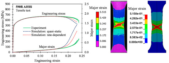 To evaluate the experimental methodology of using the tensile and shear tests to obtain the hardening behavior, the accuracy of the calibrated rate-dependent constitutive model was assessed in 3D tensile simulations using an implicit integration scheme in the solver LS-DYNA® (LSTC, Livermore, CA, USA). Owing to symmetry about two axes, only one quarter of the tensile specimen was simulated and discretized with fully-integrated solid elements of 0.3 × 0.3 × 0.14 mm3. A velocity of 0.05 mm/s was prescribed to the nodes on the top gripping area whereas the degree of freedom of the nodes in the bottom gripping area was fully constrained. The isotropic von Mises yield function was adopted for the 3D simulations since the Barlat Yld2000 model is limited to plane stress elements only and because the anisotropy of the AHSS was mild as discussed in Section 2.3.