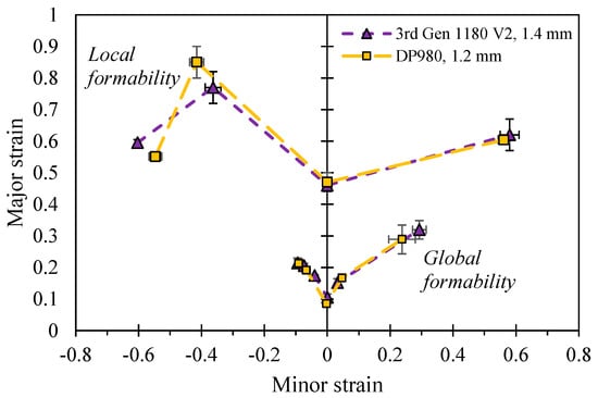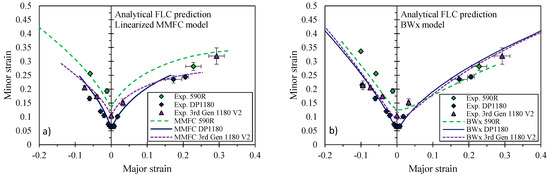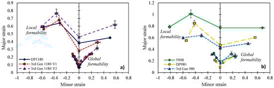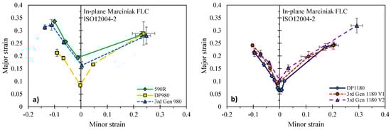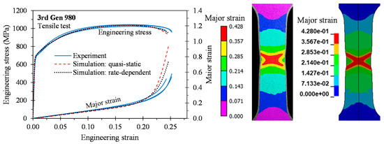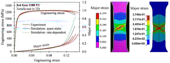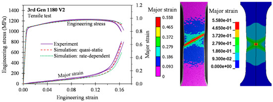 As depicted in Figure 15, Figure 16, Figure 17 and Figure 18, the predicted global stress–strain responses are in good overall agreement for the 3rd Gen steels and the 590R. The predicted response for the 590R and 3rd Gen 1180 V1 is softer than observed in the tests which is attributed to the isotropic models predicting a severe double shear band for localization while only a single band formed in the tests. The predicted responses for the 3rd Gen 980 and the 3rd Gen 1180 V2 are in close agreement with the experiments. Limitations upon the mesh size in the finite-element model, isotropic assumption, and limited resolution for resolving local strains upon localization might be responsible for the observed deviation. The influence of the strain rate was relatively minor in the tensile tests such that both the quasi-static and rate-dependent constitutive model predict the local response to similar level of accuracy. Overall, the tensile simulations confirmed that the experimentally-derived constitutive model is sufficiently accurate for forming applications that will be demonstrated in the next section on analytical formability prediction.