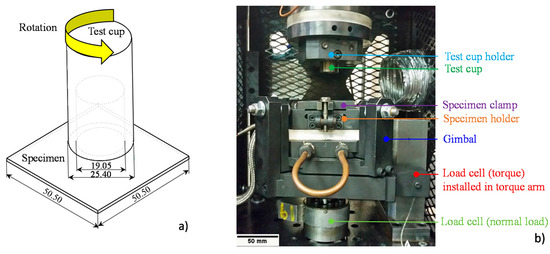 where T represents the measured reaction torque caused by the resistance to sliding, A the contact area, rm the mean cup radius and P the applied interface pressure. The test apparatus utilized in this study is depicted in Figure 19b. The test cup is positioned in the cup holder with the aid of a set screw and the specimen is located in the specimen holder. The angular rotation of the test cup is controlled through a hydraulic motor. The specimen holder is embedded in a gimbal assembly which serves as self-alignment mechanism to ensure parallel contact of the specimen and test cup during testing. The normal load is applied to the specimen through a hydraulic actuator with a 22.4 kN load cell installed. The frictional torque is measured with the aid of a 45 N-load cell positioned in the torque arm. For details on the test apparatus, the reader is referred to Noder et al. [40]. The process parameters of the friction test were carefully selected to represent an industrial forming process for AHSS using the CommDrawTM 220 (Commonwealth Oil Corporation, Harrow, ON, Canada) lubricant provided by the automotive toolmaker, Bowman Precision Tooling. An interface pressure of 25 MPa, and a sliding distance of 75 mm were obtained from a forming simulation of a structural B-Pillar of the studied 3rd Gen 980 documented in Gutierrez et al. [41]. The sliding speed of 5 mm/s is on the lower bound of the forming speed in the B-pillar stamping process but was selected to produce a smooth and stable friction response. Square specimens were sheared to a length of 50.5 mm by 50.5 mm, deburred, and cleaned with acetone. The lubricant was applied with a pump spray to ensure even wetting of the specimen surface. A total of four repeats were conducted per test condition. Test cups made of Uddeholm Dievar® (Uddeholm, Hagfors, Sweden) chromium-molybdenum-vanadium alloyed tool steel, hardened to 53 HRC (Rockwell hardness), were utilized for testing and replaced after each test.