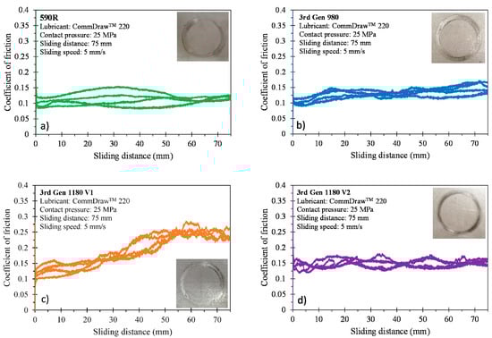 Evolution of the frictional response over the 75 mm sliding distance for the 590R (a), 3rd Gen 980 (b), 3rd Gen 1180 V1 (c) and 3rd Gen 1180 V2 (d).