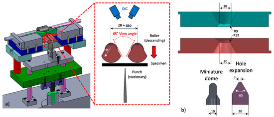 Tensile tests at an initial strain rate of 0.001 s−1 were performed utilizing a 100 kN electromechanical MTS Criterion 45 tensile frame (Eden Prairie, MN, USA). The JIS No. 5 geometry, as shown in Figure 1a, was extracted at 22.5° angles with respect to the sheet rolling direction (RD) and a minimum of three repeats were conducted for each test condition. Unless otherwise stated, full-field stereoscopic digital image correlation (DIC) technique and the software Vic3D-8® of Correlated Solutions Inc. (Irmo, SC, USA), was adopted for optical strain measurements in all experiments. Settings related to DIC analysis along with the Virtual Strain Gauge Length (VSGL) are recorded in Table 1.