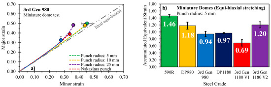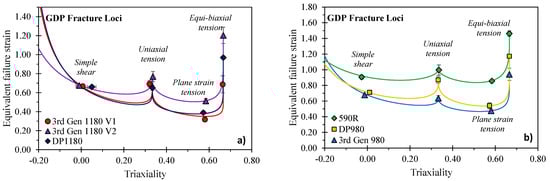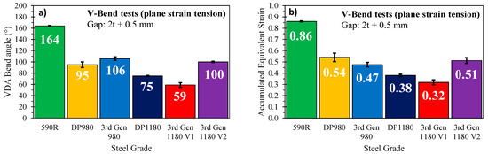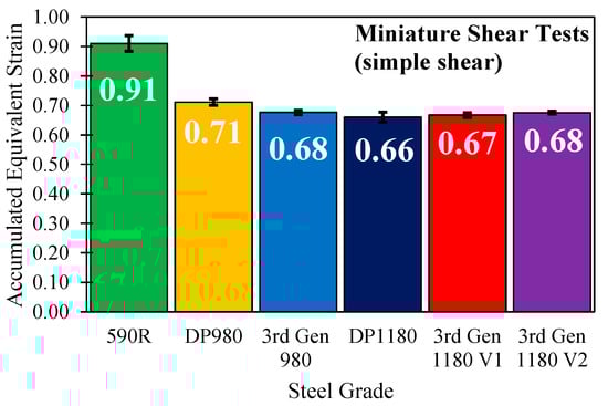 As depicted in Figure 6, the stress anisotropy of all studied steel grades was relatively low and the 3rd Gen steels are comparable to the observed behavior for DP steels. Overall, the strength in the transverse direction was about 2% higher than in the rolling direction. The normal anisotropy was close to unity (isotropy) and varied from 0.88 to 0.95 for the 3rd Gen 1180 V1 and the DP980, respectively, which highlights the mild plastic anisotropy in the studied steel grades. A similar trend is observed for the shear anisotropy with the 3rd Gen 1180 V2 being closer to a von Mises material, whereas the 3rd Gen 1180 V1 resembles the DP1180 with a shear stress ratio of greater than 0.6. The 3rd Gen 980 features slightly lower R-values than the DP980 and the 590R steel. The commercial 3rd Gen steels considered appear to have comparable or less anisotropy compared to conventional AHSS.