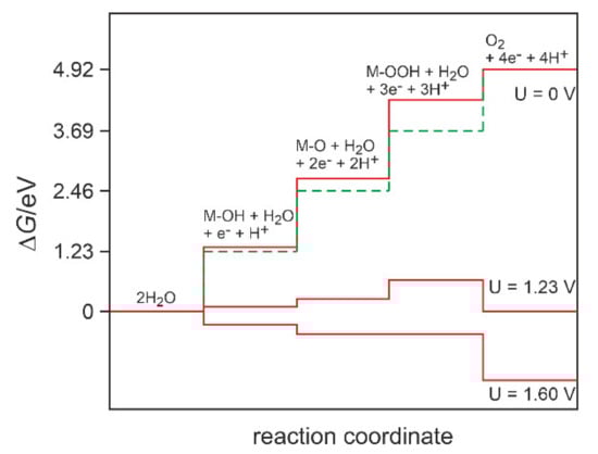 The equilibrium redox potential (Er) for the splitting of a water molecule is 1.23 V. For practical yields in electrolysis cells, a higher voltage is required. This additional voltage, above 1.23 V, is called the overpotential (η). From the mechanistic point of view, the most popular proposed reaction schemes involve the coupling of electron and proton transfer in every step. If this coupling was always present in the oxygen evolution reaction pathway, it would put severe limitations on the optimization of the catalysts. In such a case, the energy barrier for each of the electron transfer steps would be different, and thus at least one would be higher than 1.23 V and the thermodynamic potential of the overall reaction could not be attained (Figure 1). However, highly active OER catalysts can be designed as multi-component materials, where the proposed linear correlation of the binding energies of intermediates (scaling relations) are valid no more, and other mechanisms may come into play [11]. Nonetheless, high catalytic activity is only one of the requirements for a practical application of an OER catalyst in water splitting devices since the catalytic materials are also required to exhibit long-term stability.