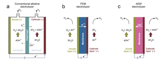 Schematic diagrams of electrolyzers for low temperature water splitting. Commercially available technologies: (a) liquid KOH and (b) proton exchange membrane (PEM) electrolyzers. Development stage technology: (c) anion exchange membrane (AEM) electrolysis.