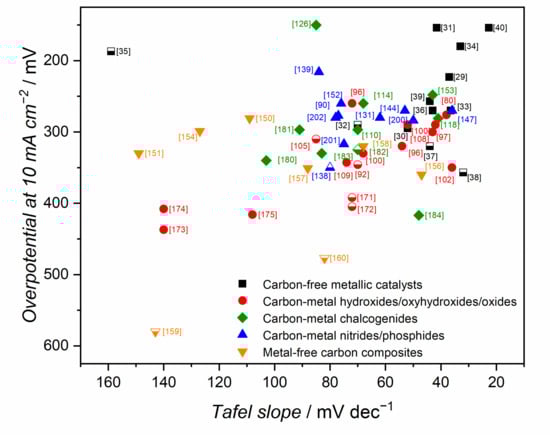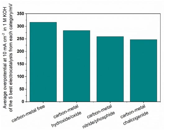 Similarly to metal hydroxides and oxides, in the case of transition metal chalcogenides (TMCs) the most promising catalysts are Fe, Co, and Ni-based materials, including metal sulfides, selenides, and tellurides [42,43]. While TMCs have been broadly investigated in the electrocatalytic hydrogen evolution reaction, there is still room for their optimization towards OER.