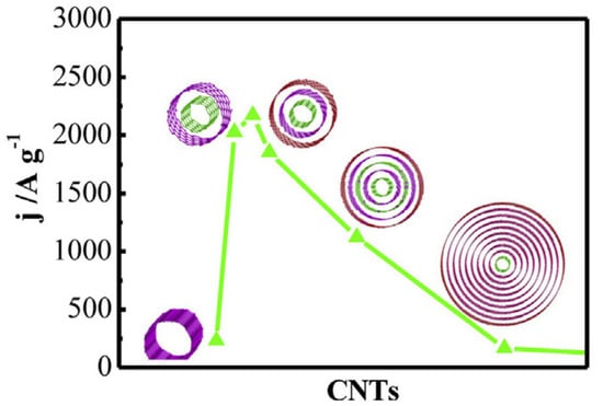To obtain MnxCo3−xO4 nanocrystals decorated on carbon nanotubes, the CNTs were preoxidized in nitric acid by heating at 110 °C with reflux. Then, they were dispersed in ethanol in a round-bottomed flask and sonicated to ensure uniform dispersion and metal acetates were added. Then ammonia solution was added and the solution was then heated to 80 °C (20 h). Finally, the reaction mixture was transferred to a 100 mL Teflon-lined autoclave for a solvothermal reaction at 150 °C for 3 h. The product was collected by centrifugation, washed with deionized water several times, and freeze-dried to obtain the final product, MCO@NCNTs [89].