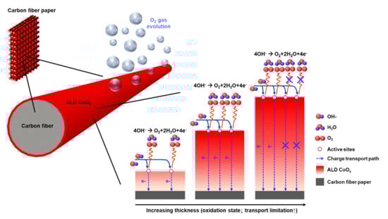 Water electrolysis using renewable energy sources and water as a substrate may be an answer to the problem of sustainable hydrogen production. It is also a fascinating subject for studies from the fundamental point of view as the reaction itself is very complex, as are the reaction conditions. The oxidation of oxygen atoms from water releases the protons and electrons required for the formation of hydrogen gas. However, water oxidation, whether in acidic or alkaline conditions, suffers from the kinetic limitations of the oxygen evolution reaction (OER) at the anode rather than by the limitations associated with the hydrogen evolution reaction (HER) at the cathode. The reason is mostly due to the four-electron transfer process of the OER compared to the two-electron transfer step of the HER [7]. At the same time, for practical applications, the architecture of the electrode interface plays an equally important role, since a triple-phase boundary of gas, liquid electrolyte, and solid electrocatalyst is the scene where the water electrolysis takes place [10].